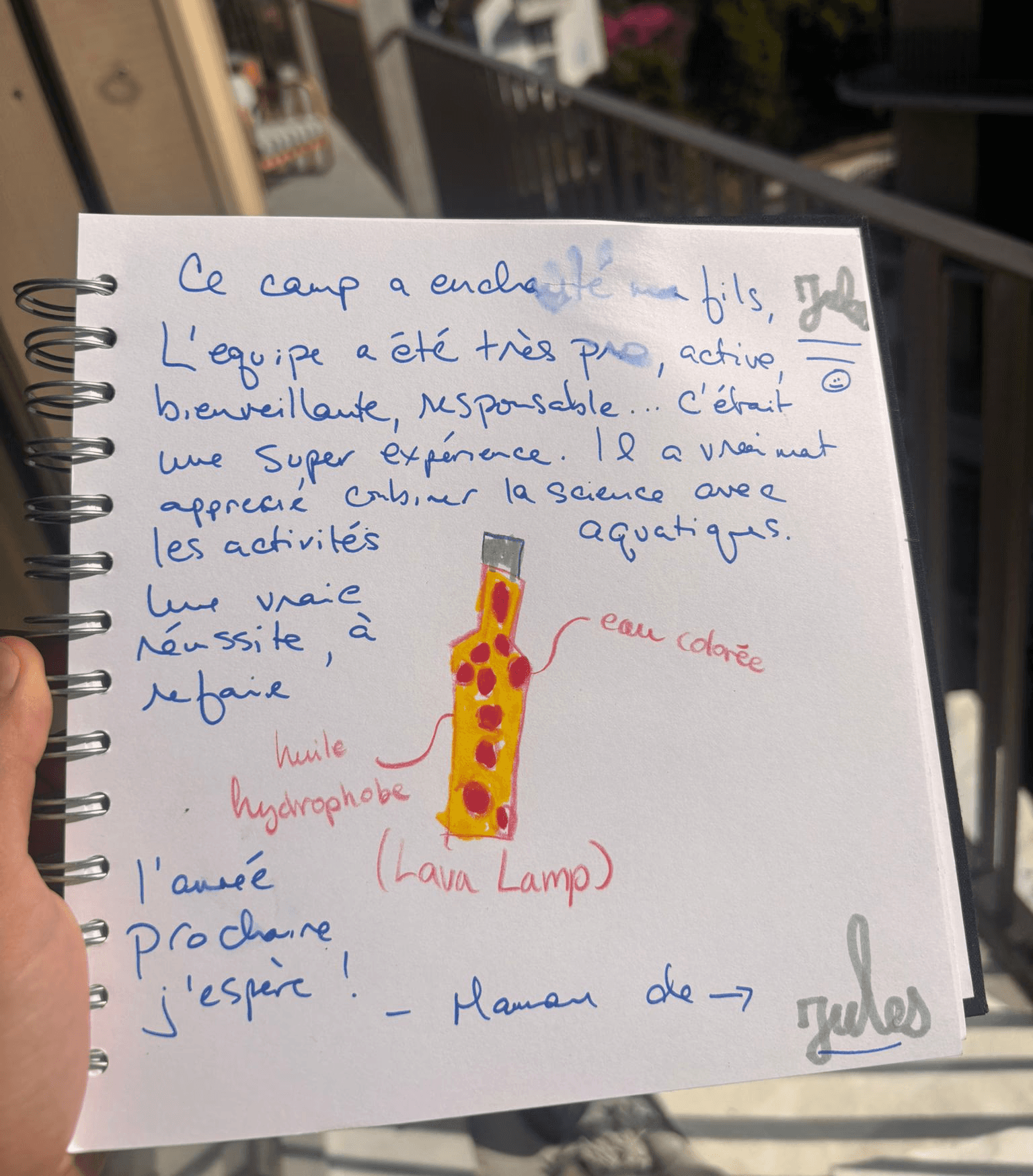 Ils vont participer à des activités scientifiques qui démontrent un phénomène illustré dans un conte auparavant. Il y aura aussi des balades en nature et une activité paddle au lac. Des ateliers, où ils peuvent créer des choses comme de mini-écosystèmes, font aussi partie du programme.